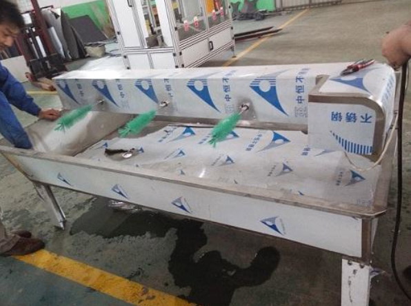 A、该机采用不锈钢制作,由毛刷转动机构、浸泡池、输瓶线组成,主要用于旧瓶的浸泡、内刷及瓶子刷后的运输。