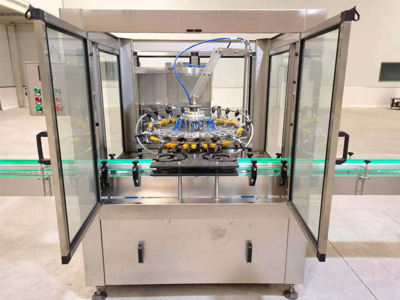 整机采用圆周运行翻转瓶式结构冲洗,配以进口电气控制元件及自动翻转式机械手,具有自动夹紧定位瓶口、自动冲洗功能,整体美观耐用。